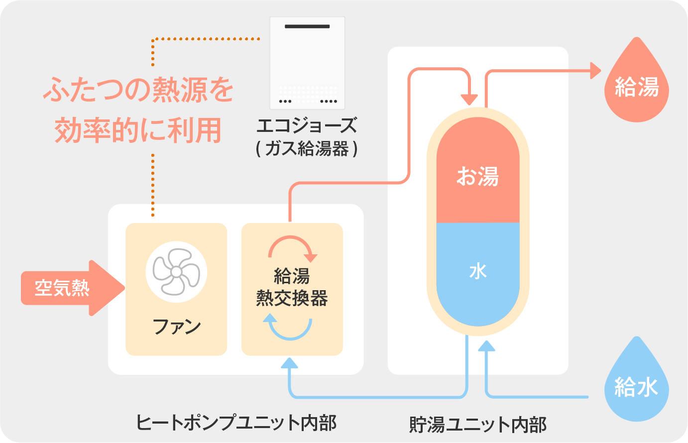 ヒートポンプ給湯機とガス温水機器を組み合わせたもの。ふたつの熱源を効率的に⽤いることで、⾼効率な給湯が可能です。